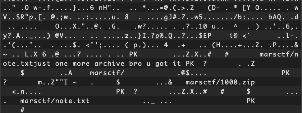 Extracting 1000.zip reveals a recursive 1000-level zip archive, explaining the humor in note.txt: "just one more archive bro u got it"