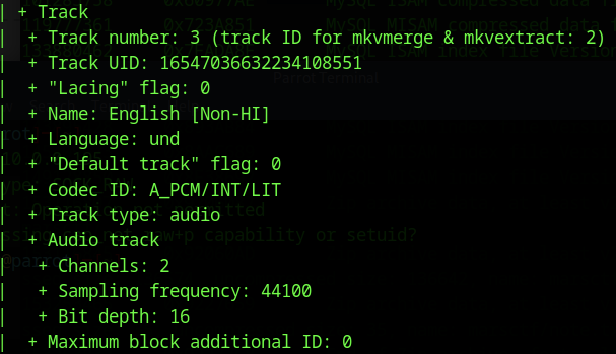 Using the command mkvinfo from the MKVToolNix package reveals there are multiple tracks, but we want an audio track.
