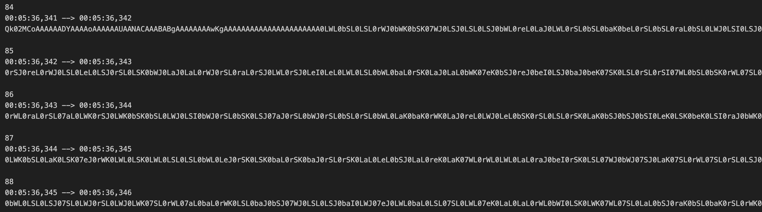 In total, there were 1844 subtitle entries with encoded data—2000 characters each (except the last one, with 472 characters). Using some simple regex, we can concatenate every block of data into one continuous string. Following the pattern from before, we can assume this is, you guessed it, base64 again, and run a command to decode it: